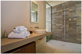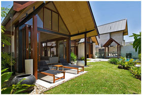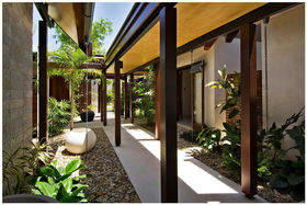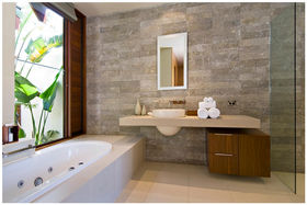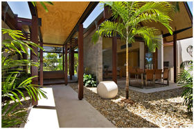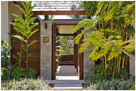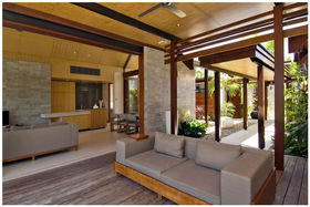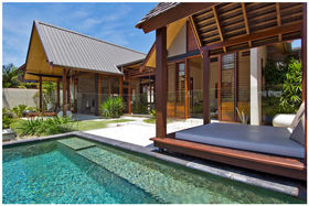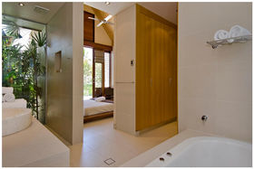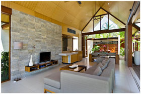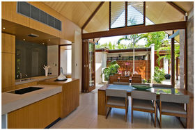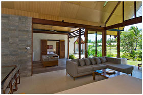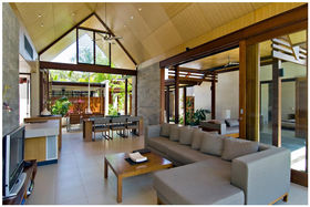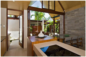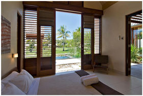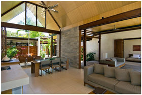 The property consists of three spacious air-conditioned bedrooms in separate pavilions, all linked together with covered walkways merging into a large central living, kitchen and dining pavilion. The airflow and tropical feel is simply amazing. The master bedroom is en-suited and enjoys a stunning outlook over your private plunge pool and the landscaped gardens behind.